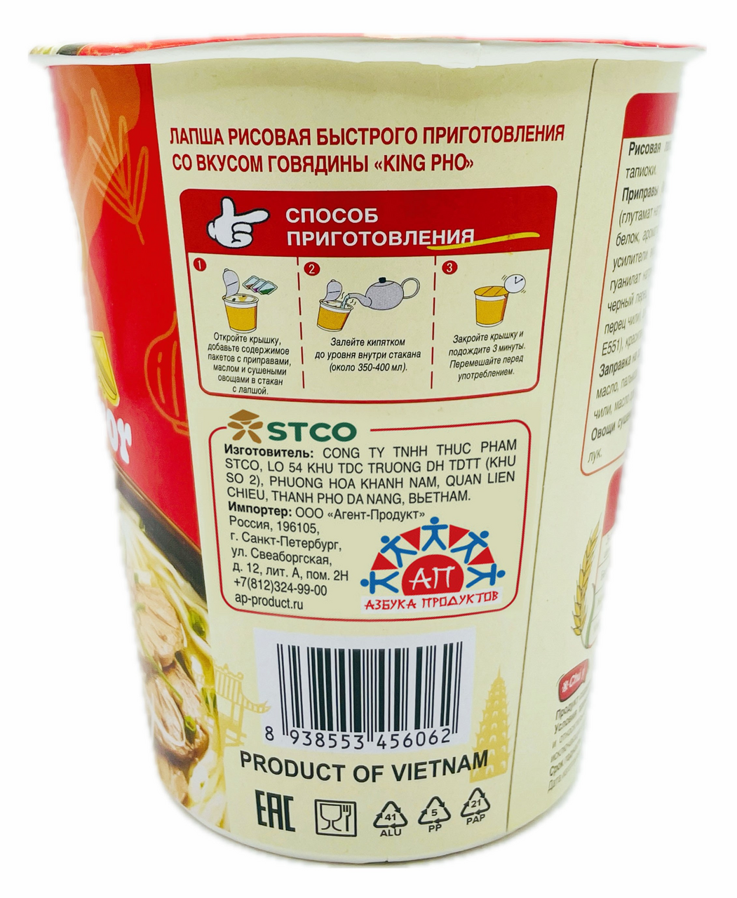 Рисовая лапша King Pho Азбука продуктов - это новый продукт быстрого приготовления, который производится во Вьетнаме компанией STCO, имеющей все необходимые сертификаты, соответствующие международным стандартам. Рисовая лапша King Pho Азбука продуктов соответствует нескольким актуальным тенденциям: растущей популярности азиатской кухни и стабильному спросу на продукты, не требующие длительного приготовления. Лапша быстрого приготовления King Pho Азбука продуктов производится по особой технологии, исключающей этап обжарки в масле. Она сушится естественным способом, что делает рисовую лапшу менее калорийной и сохраняет всю пользу входящих в ее состав микроэлементов. При этом приготовить ее можно всего за 3-5 минут, и вы получите ароматное блюдо в лучших традициях Азии. Рисовая лапша King Pho Азбука продуктов - это хорошая возможность за несколько минут попробовать разнообразные азиатские вкусы по доступной цене для каждого. то уникальное сочетание вьетнамской кухни и современных технологий приготовления. Эта лапша быстрого приготовления сделана из высококачественного риса, который обеспечивает ее отличную текстуру и вкус. Она имеет уникальный аромат говядины благодаря своим приправам и заправкам на основе растительного масла. В отличие от пшеничной, азиатская рисовая лапша является более диетической, так как готовится из рисовой муки и высушивается, а не обжаривается. Это значит, что в ней нет избыточного количества жиров и масел, это полезная рисовая лапша.