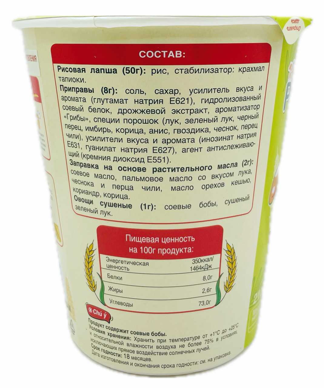 Рисовая лапша 50г: рис, стабилизатор: крахмал тапиоки; Приправы 8г: соль, сахар, усилитель вкуса и аромата глутамат натрия Е621, гидролизованный соевый белок, дрожжевой экстракт, ароматизатор Грибы, специи порошок лук, зеленый лук, черный перец, имбирь, корица, анис, гвоздика, чеснок, перец чили, усилители вкуса и аромата инозинат натрия Е631, гуанилат натрия Е627, агент антислеживающий кремния диоксид Е551; Заправка на основе растительного масла 2г: соевое масло, пальмовое масло со вкусом лука, чеснока и перца чили, масло орехов кешью, кориандр, корица; Овощи сушеные 1г: соевые бобы, сушеный зеленый лук.