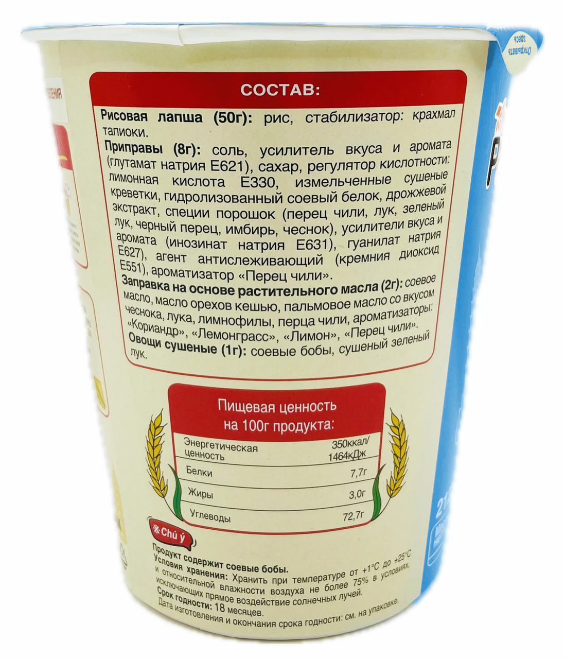 Рисовая лапша 50г: рис, стабилизатор: крахмал тапиоки; Приправы 8г: соль, усилитель вкуса и аромата глутамат натрия Е621, сахар, регулятор кислотности: лимонная кислота Е330, измельченные сушеные креветки, гидролизованный соевый белок, дрожжевой экстракт, специи порошок перец чили, лук, зеленый лук, черный перец, имбирь, чеснок, усилители вкуса и аромата инозинат натрия Е631, гуанилат натрия Е627, агент антислеживающий кремния диоксид Е551, ароматизатор Перец чили; Заправка на основе растительного масла 2г: соевое масло, масло орехов кешью, пальмовое масло со вкусом чеснока, лука, лимнофилы, перца чили, ароматизаторы: Кориандр, Лемонграсс, Лимон, Перец чили; Овощи сушеные 1г: соевые бобы, сушеный зеленый лук.