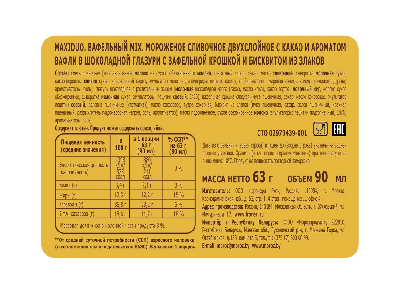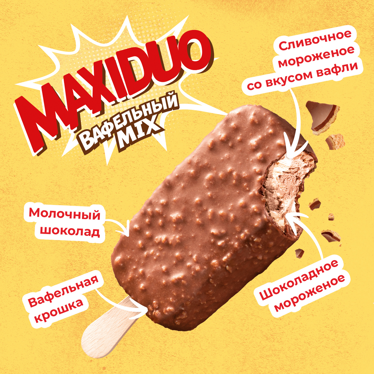 Maxiduo Вафельный Mix - встречайтепервое эскимо бренда Maxiduo! Эскимо Maxiduo Вафельный Mix — это фантастически вкусное сочетание шоколадного мороженого и мороженого со вкусом вафли, покрыто настоящим молочным шоколадом с миксом вафельной крошки. Попробовав нашу новинку один раз, остановиться будет просто невозможно. Maxiduo – максимальное удовольствие!