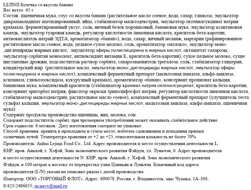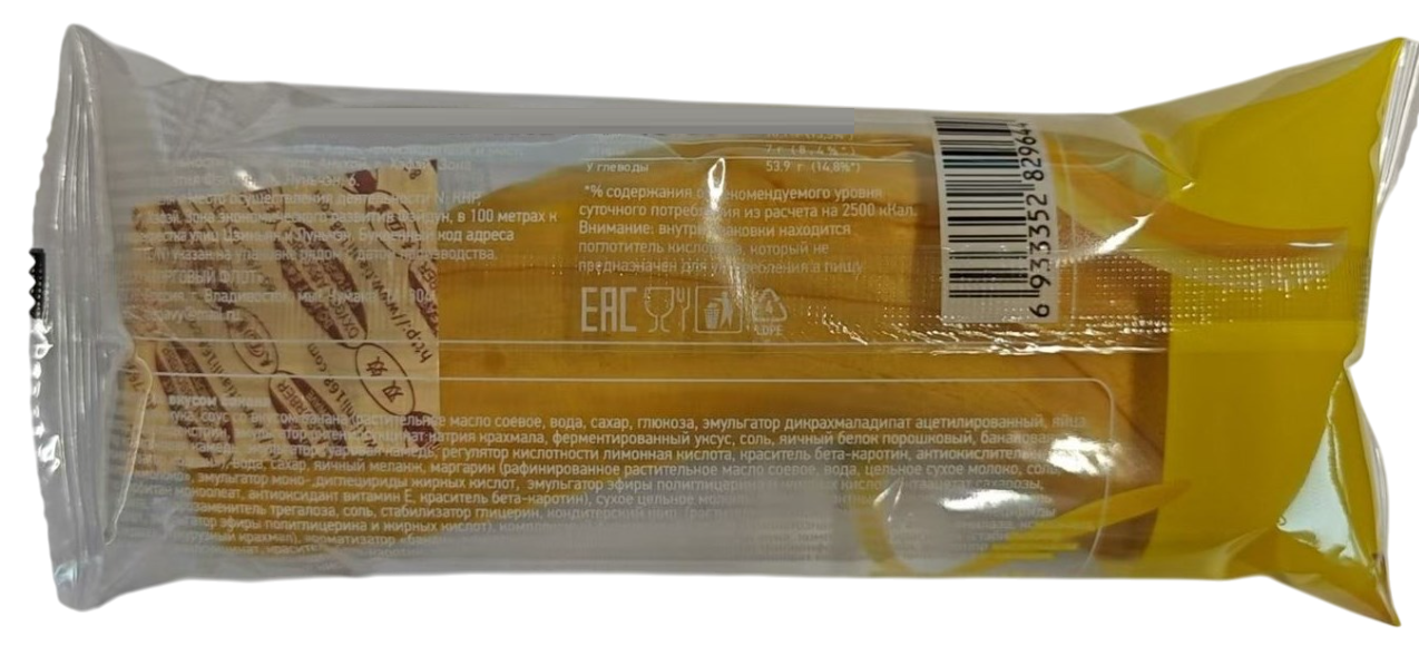 Мука пшеничная, вода питьевая, дрессинг (банановый порошок ≥ 12%), маргарин (рафинированное растительное масло, сахар, вода, смесь эмульгаторов (моно - и диглицериновые эфиры жирных кислот, полиглицериновые эфиры жирных кислот), ароматизатор (молоко), фосфолипиды, антиоксидант витамин Е, краситель В-каротин), сахар, яйца, подсластитель сорбит, сухое цельное молоко, сухие дрожжи, загуститель глицерин, сахарозаменитель трегалоза, сложные эмульгирующие ферментные препараты ((моно - и диглицериды), сложные эфиры жирных кислот, фосфолипиды, стабилизатор Е481 (стеароил лактилат натрия), пищевая соль, глютен, эмульгаторы (моно - и диглицериловые эфиры жирных кислот, моно - и диглицериды диацетилвинной кислоты), сложные консерванты (сорбиновая кислота, пропионат кальция), краситель В-каротин, ароматизатор (банан).