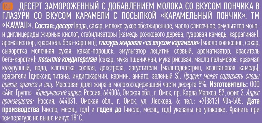 Десерт (вода, сахар, молоко сухое обезжиренное, масло сливочное, эмульгатор моно- и диглицериды жирных кислот, стабилизаторы (камедь рожкового дерева, гуаровая камедь, каррагинан), ароматизатор, краситель бета-каротин); глазурь жировая со вкусом карамели (масло кокосовое, сахар, сыворотка молочная сухая, какао-порошок, эмульгатор лецитин соевый, ароматизатор, краситель бета-каротин); посыпка кондитерская (сахар, мука пшеничная, мука рисовая, масло пальмовое, крахмал кукурузный, вода, клетчатка соевая, декстроза, загустители (мальтодекстрин, ксантановая камедь), красители (диоксид титана, индигокармин, кармин, аннато, зелёный S).