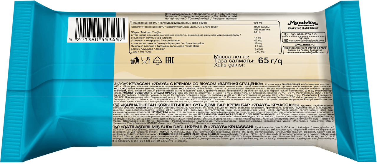 Участвует в конкурсе: Выиграйте кофемашину на сладкое! Совершите покупку товаров-участников на сумму от 1500₽ с 23 октября 2025г. по 14 января 2026г. и получите шанс выиграть кофемашину или другие сладкие призы! Чем больше покупок - тем больше шансов на победу! Подробнее об акции - https://cdn.metro-cc.ru/ru/mndlz_2025.pdf. Круассан 7 days с вареной сгущенкой идеально сочетается с чаем и кофе, но не менее приятен в дополнение к сокам, воде или другим напиткам. Попробуйте яркую аппетитную выпечку, дарите себе и своим близким радостные мгновения каждый день. Мягкий круассан из слоеного теста с кремовой начинкой. Выпечка станет прекрасным вариантом для перекуса и подойдет к чаю и кофе. Круассан 7Days удобно упакован и уже готов к употреблению. Берите выпечку с собой на природу или в дорогу: в самолет, путешествие на машине или поездку в поезде.