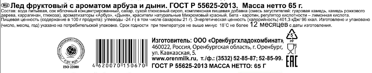 Фруктовый лед Оренмилк с ароматом арбуз-дыня, 65г – это ледяная свежесть со вкусом любимого фрукта в формате эскимо на палочке, удобном для перекуса на прогулке или в любое другое время.