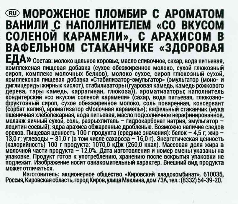 Молоко цельное коровье, масло сливочное, сахар, вода питьевая, комплексная пищевая добавка сухое обезжиренное молоко, сухой глюкозный сироп, комплекс молочных белков, молоко сухое, сироп глюкозный сухой, комплексная пищевая добавка Стабилизатор-эмульгатор эмульгатор моно- и диглицериды жирных кислот, стабилизаторы гуаровая камедь, камедь рожкового дерева, тары камедь, каррагинан, глюкоза, ароматизаторы; наполнитель кондитерский со вкусом соленой карамели сахар, вода питьевая, глюкозно-фруктозный сироп, сухое обезжиренное молоко, соль поваренная, консервант сорбат калия, ароматизатор Молочная карамель; вафельный стаканчик мука пшеничная хлебопекарная, вода питьевая, масло подсолнечное нерафинированное, меланж яичный сухой, соль, разрыхлитель – гидрокарбонат натрия, эмульгатор – лецитин соевый; ядра арахиса обжаренные дробленые.