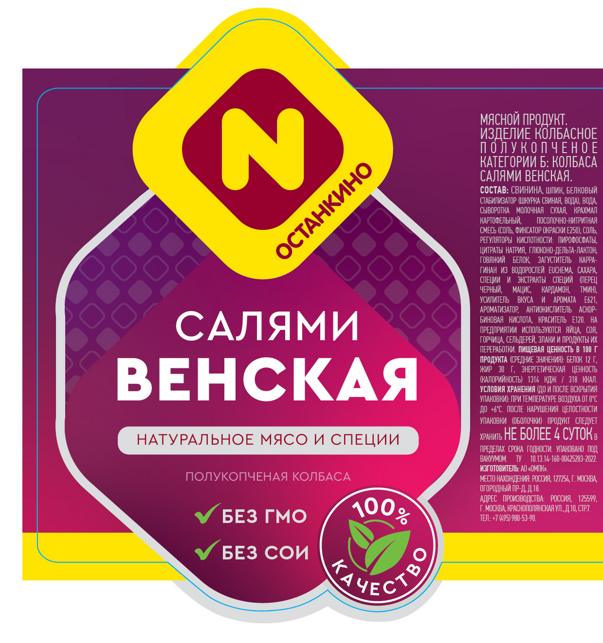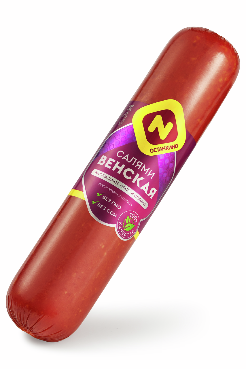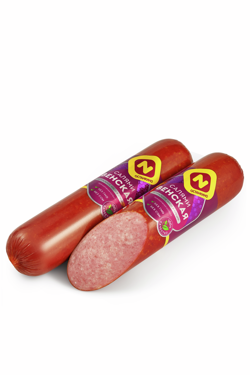 Салями Венская полукопченая изготавливается из свинины и говядины с добавлением шпика. Продукт имеет мягкий вкус и приятный аромат классической копченой колбасы.