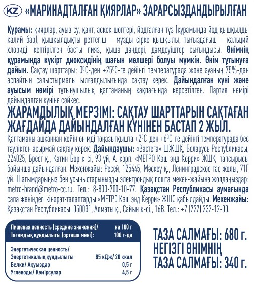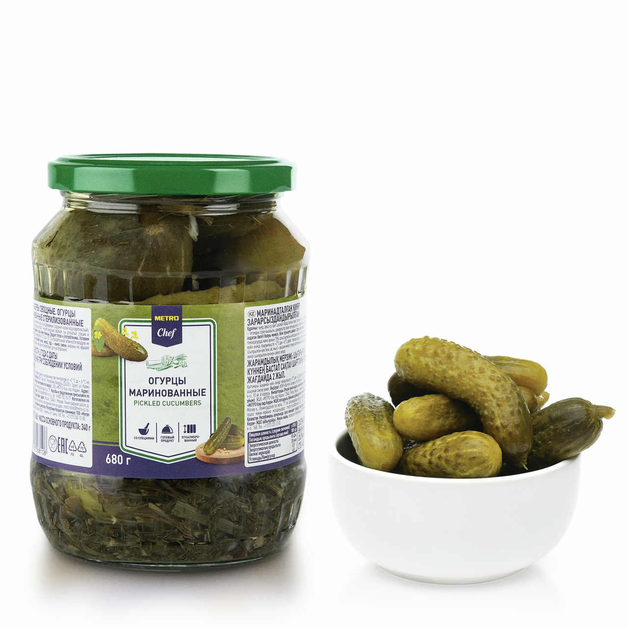 METRO Chef Огурцы маринованные — вкусные однокомпонентные овощные консервы. В состав продукта входят вода, соль, уксусная кислота, регулирующая кислотность, и пряности в виде укропа, чеснока, однако отсутствует ГМО.