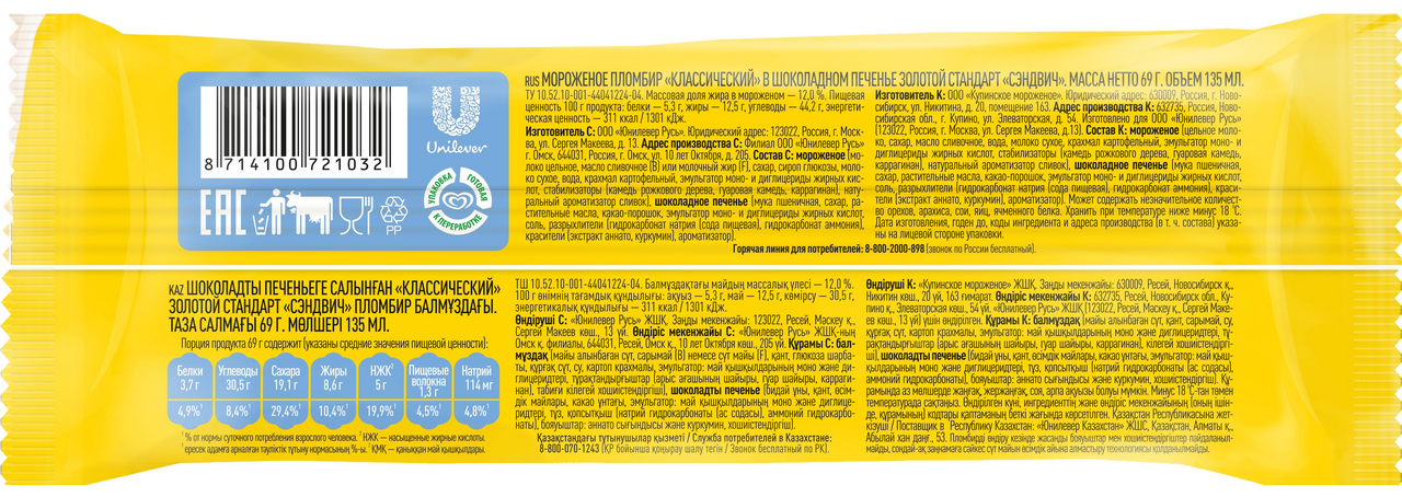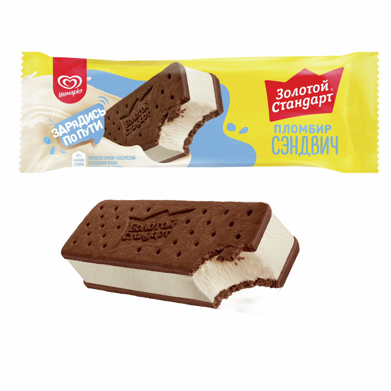 Мороженое пломбир Золотой стандарт Классическое в шоколадном печенье, 69г