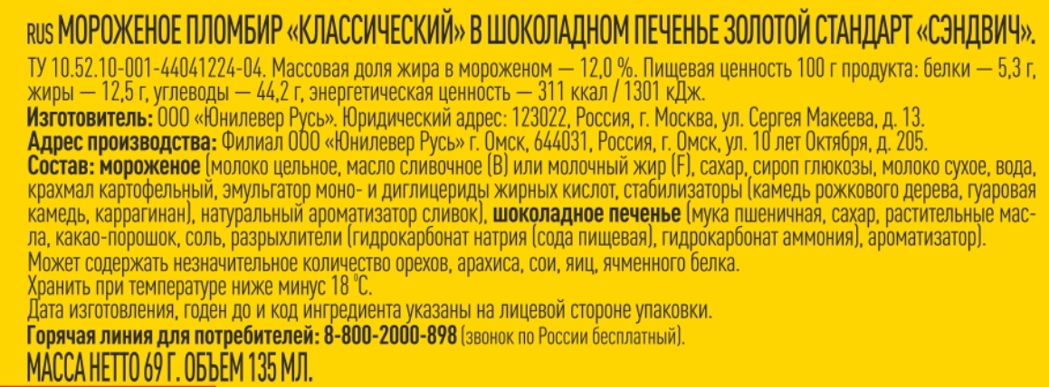 Мороженое (молоко цельное, масло сливочное (B) или молочный жир (F), сахар, сироп глюкозы, молоко сухое, вода, крахмал картофельный, эмульгатор моно- и диглицериды жирных кислот, стабилизаторы (камедь рожкового дерева, гуаровая камедь, каррагинан), натуральный ароматизатор сливок), шоколадное печенье (мука пшеничная, сахар, растительные масла, какао-порошок, соль, разрыхлители (гидрокарбонат натрия (сода пищевая), гидрокарбонат аммония), ароматизатор).