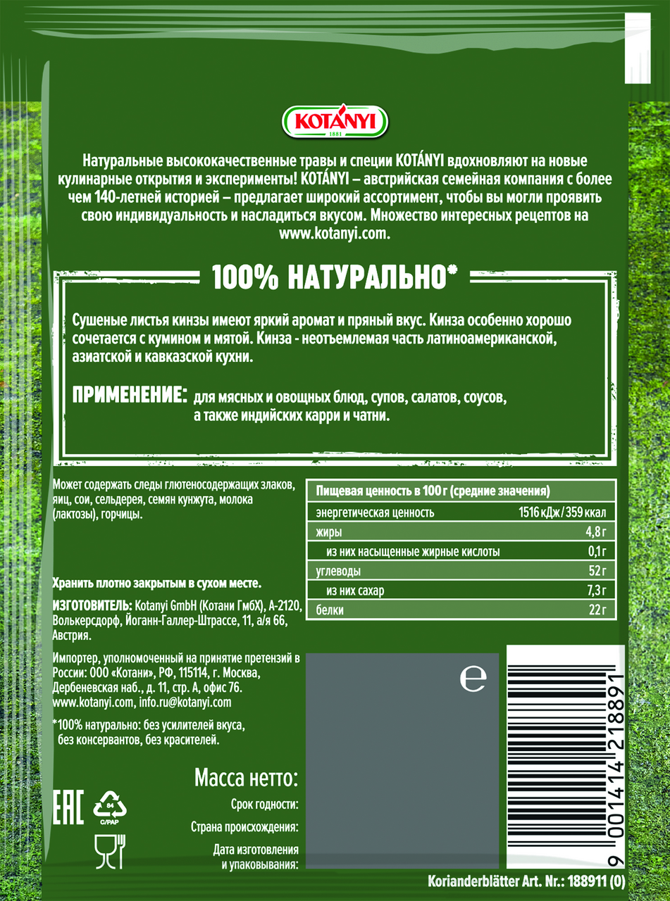 Сушеные листья кинзы имеют яркий аромат и пряный вкус. Кинза особенно хорошо сочетается с кумином и мятой. Кинза - неотъемлемая часть латиноамериканской, азиатской и кавказской кухни. Применение: для мясных и овощных блюд, супов, салатов, соусов, а также индийских карри и чатни. Ароматная и пряная приправа с мягким послевкусием кориандра. Состоит из сушеных листьев с ярким ароматом и пряным вкусом. Она особенно хорошо сочетается с кумином и мятой. Кинза – неотъемлемая часть латиноамериканской, азиатской и кавказской кухни.