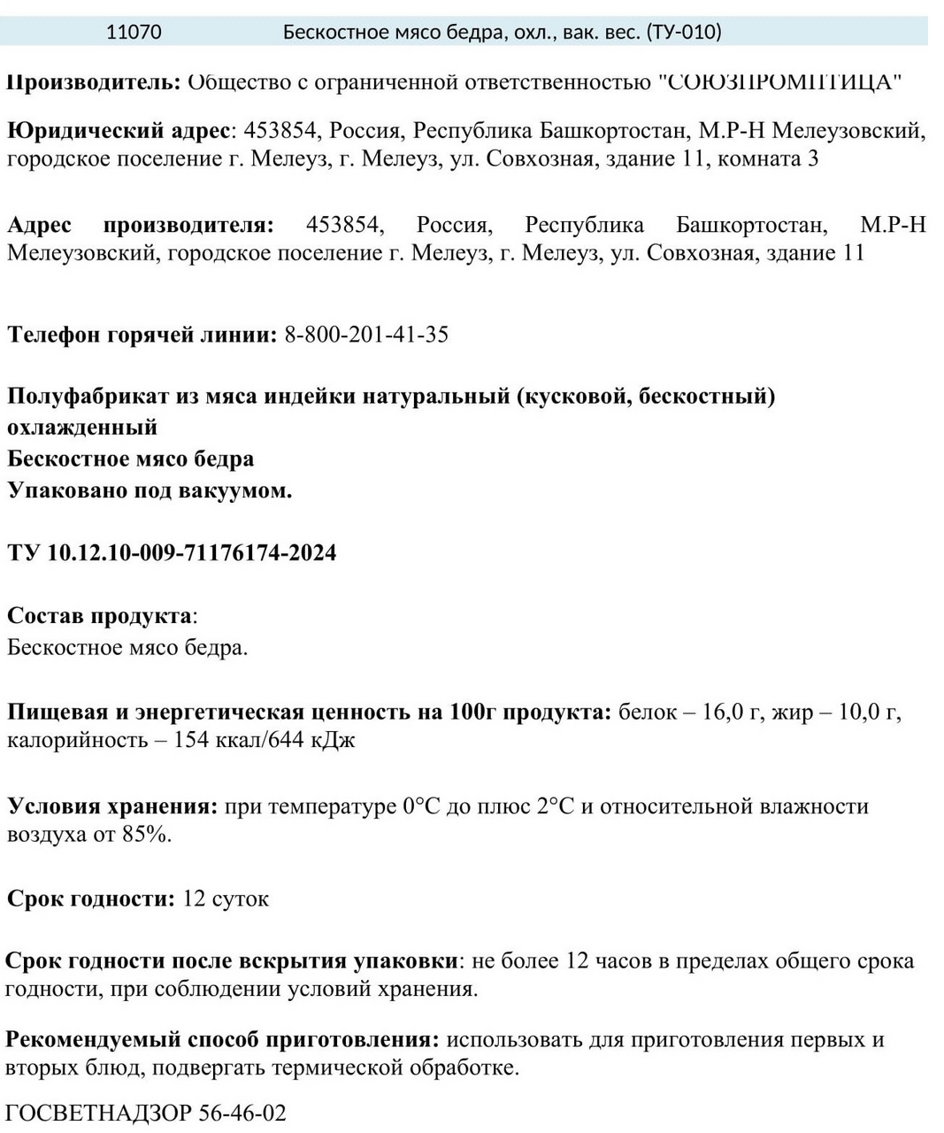 Верхняя часть окорока индейки без кости, мясо нежное, с высоким содержанием белков и минимальным количеством углеводов. Высококачественное охлажденное мясо, требующее термической обработки. Птицу разделывают в специально оборудованном холодном цеху непосредственно в день заказа, поэтому вы можете быть уверены в абсолютной свежести филе. Филе бедра можно варить, тушить, жарить, запекать, готовить на пару или на гриле. Из него можно сделать вкуснейшие котлеты, биточки, рулеты, запеканки, закуски, шницели и многое другое.