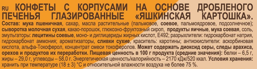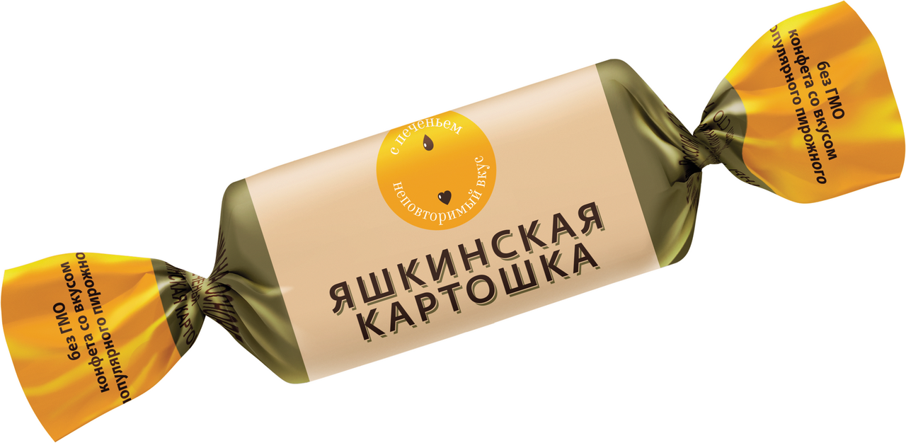 Конфета со вкусом пирожного картошка.Конфета из нежного пралине с добавлением сливочного печенья, покрытая глазурью.Преимущества: Без искусственных красителей Без консервантов Без усилителей вкуса