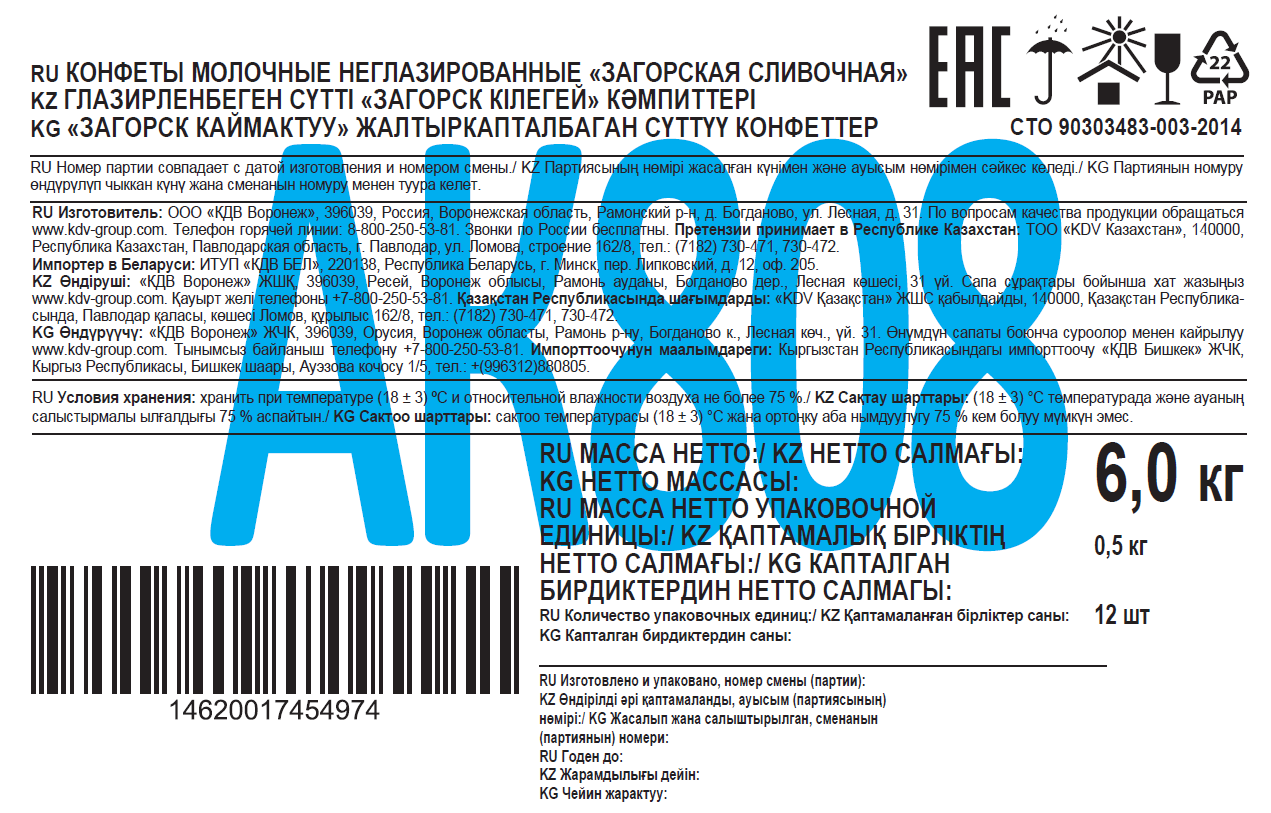 Конфеты KDV загорская сливочная, 6кг