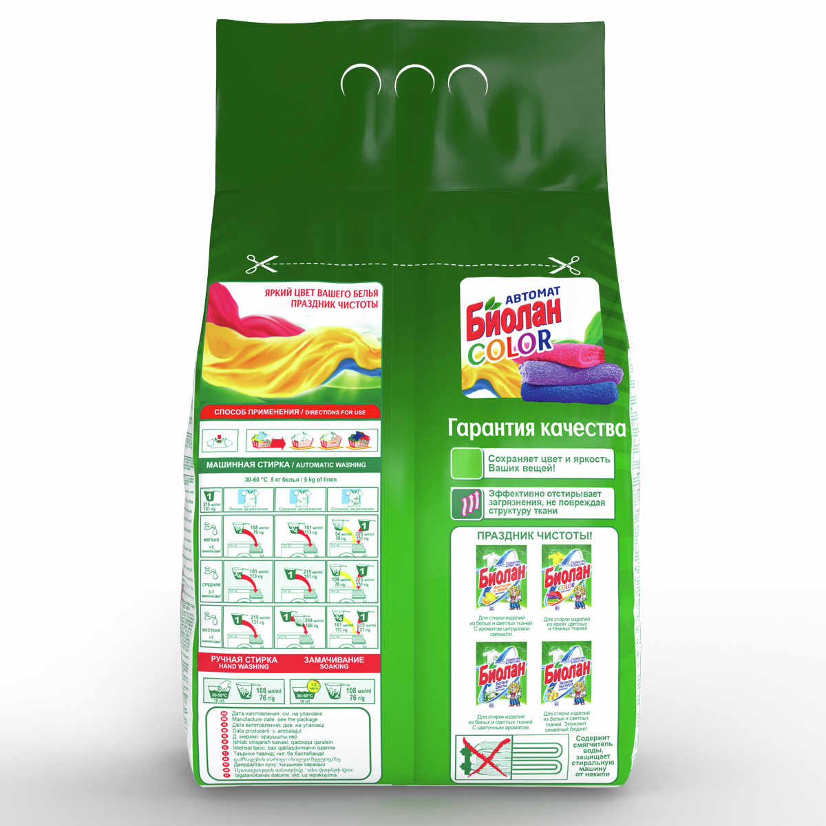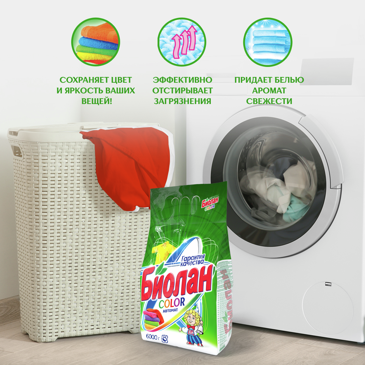 Порошок стиральный Биолан Color автомат, 6кг удаляет грязь и пятна с ярких окрашенных цветных тканей. Освежает белье, ароматизирует и сохраняет яркость красок вещей. Подходит для ежедневной стирки одежды всей семьи в автоматических стиральных машинах. Не требует использования дополнительных средств защиты стиральной машины от накипи.
