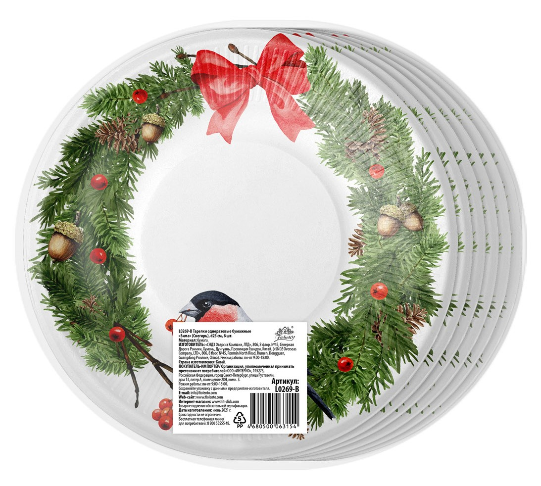 Тарелка бумажная Fiolento Зима снегирь одноразовая 23см, 6шт