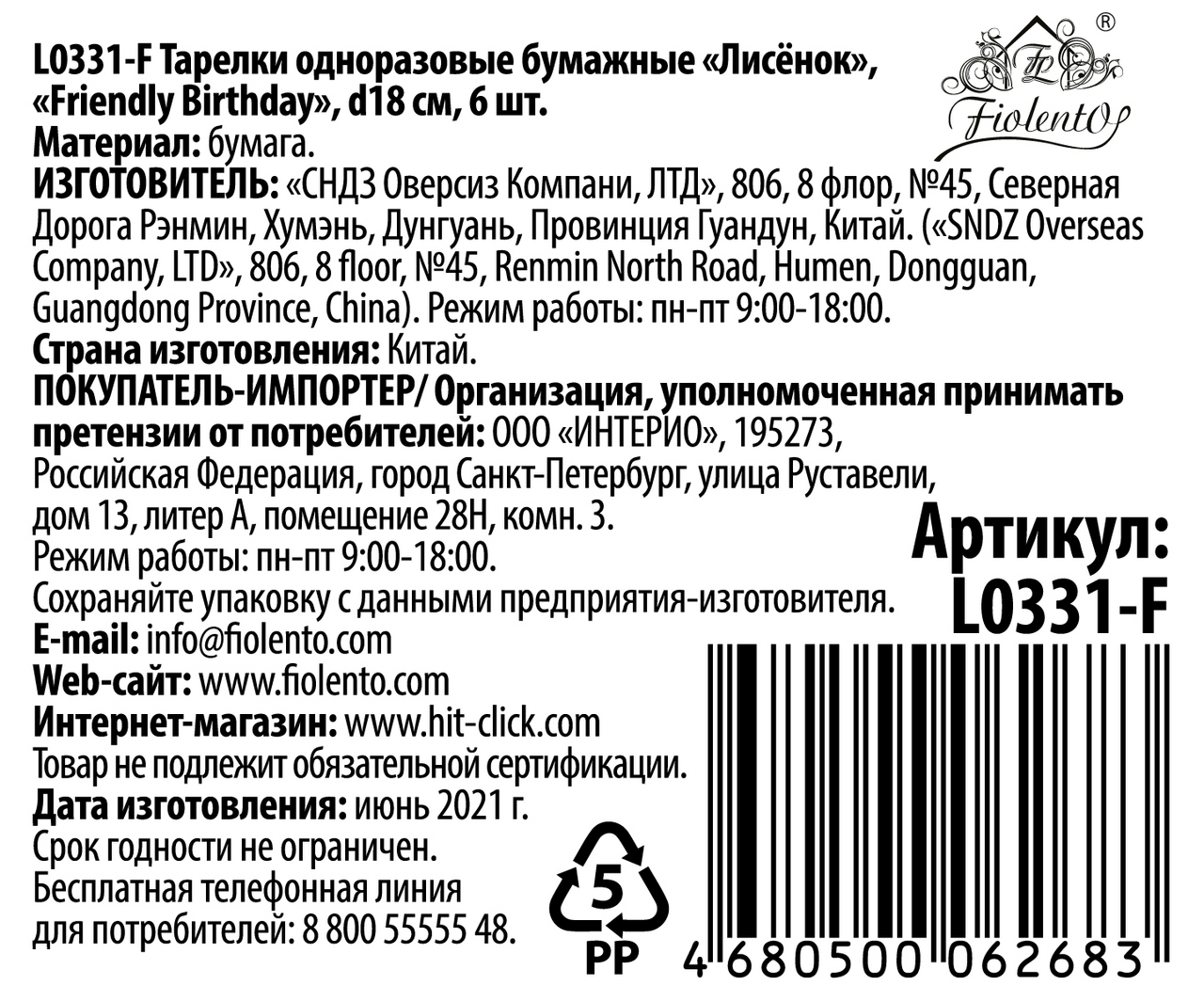 Тарелка одноразовая Fiolento Лисенок бумажная разноцветная 18см, 6шт