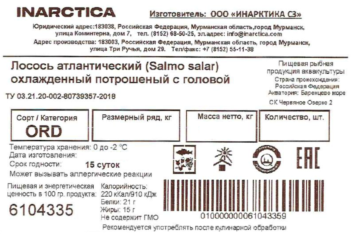 Лосось Inarctica мурманский потрошеный с головой охлажденный ORD, ~7-8кг