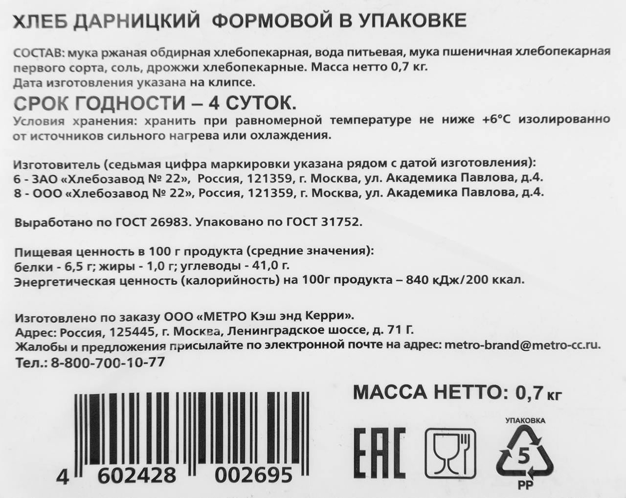 Традиционный ржано-пшеничный хлеб, изготовлен по рецептуре ГОСТ. Подойдет к любому столу — на завтрак, обед и ужин.