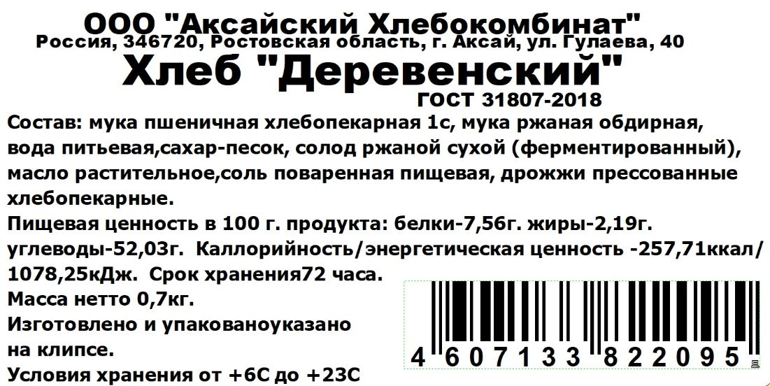 Изделие хлебобулочное из смеси ржаной и пшеничной муки хлеб Деревенский. Процесс производства бездрожжевого хлеба занимает до 2 суток, за этот срок в тесте происходят процессы ферментации, которые значительно снижают количество белка-глютена. За счет этого, а также из-за отсутствия дрожжей в составе наш хлеб идеально подходит всем, кто имеет проблемы с желудочно-кишечным трактом.