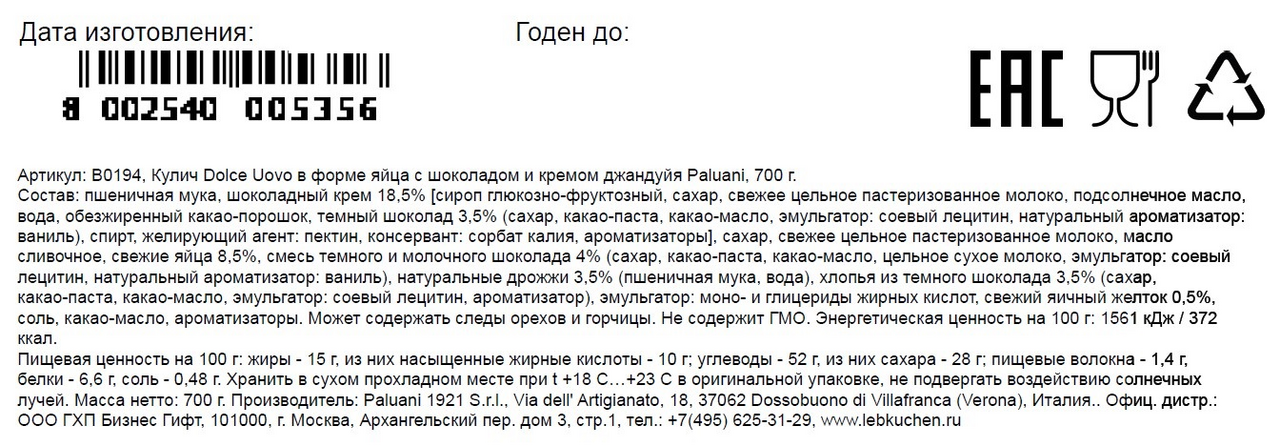 Кулич Paluani Il dolce uovo яйцо, 700г