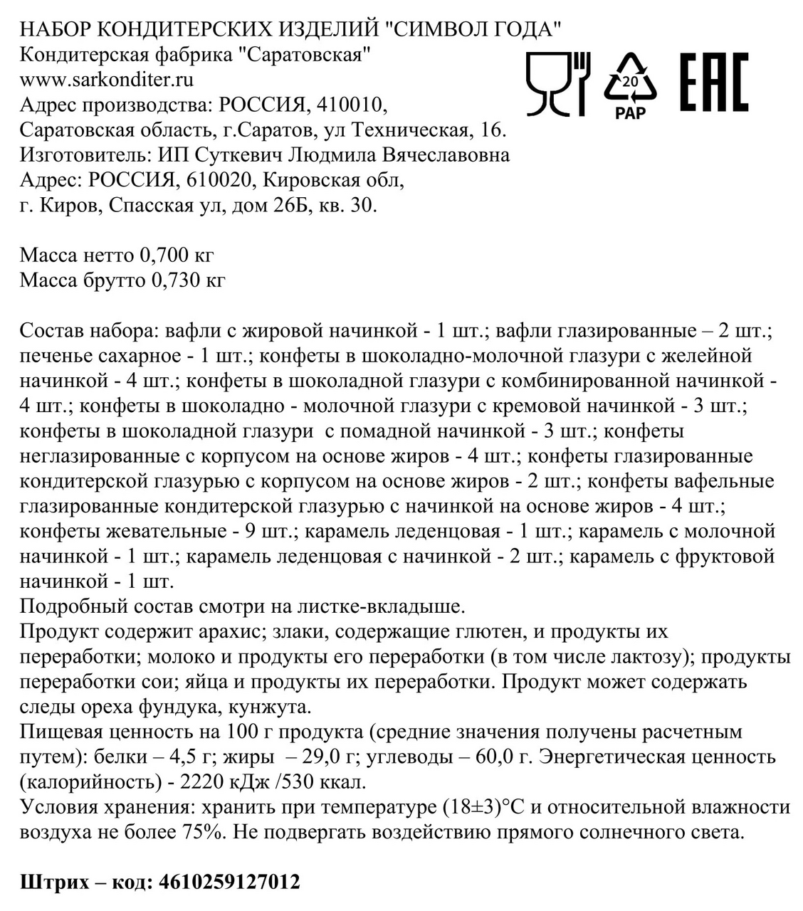 Подарок КФ Саратовская Символ года, 700г
