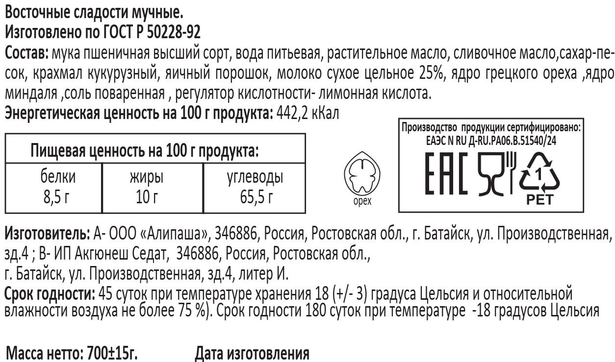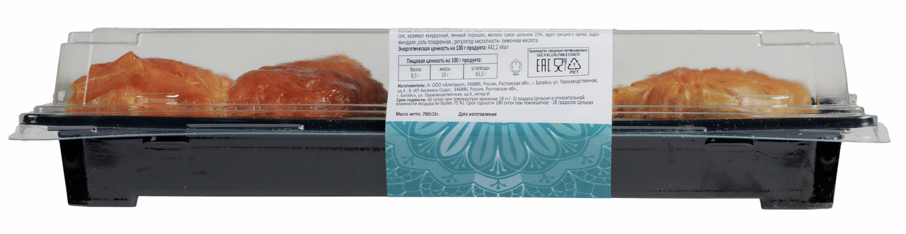 Мука пшеничная высший сорт, вода питьевая, растительное масло, сливочное масло, сахар песок, крахмал кукурузный, ядро грецкого ореха, ядро миндаля, молоко сухое цельное 25%, яичный порошок, соль поваренная, регулятор кислотности лимонная кислота.