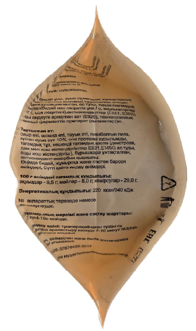 Тесто: мука пшеничная, вода питьевая, меланж смесь яичных белков и желтков, растительное масло рафинированное дезодорированное, соль пищевая, комплексная пищевая добавка Мука пшеничная хлебопекарная, эмульгаторы Е471, лецитин соевый, антиокислители Е221, Е300, вещество для обработки муки Е920, технологическое вспомогательное средство ферментный препарат липазы; фарш: говядина, свинина жирная, лук репчатый свежий, мясо цыплят-бройлеров механической обвалки, вода питьевая, сливки питьевые, клетчатка соевая пищевая, соль пищевая, ароматизатор пищевой декстроза, усилители вкуса и аромата Е621, мальтодекстрин, загуститель Е1450, вещества вкусоароматические, натуральные ароматизаторы, перец чёрный дроблёный, антиокислитель - аскорбиновая кислота.