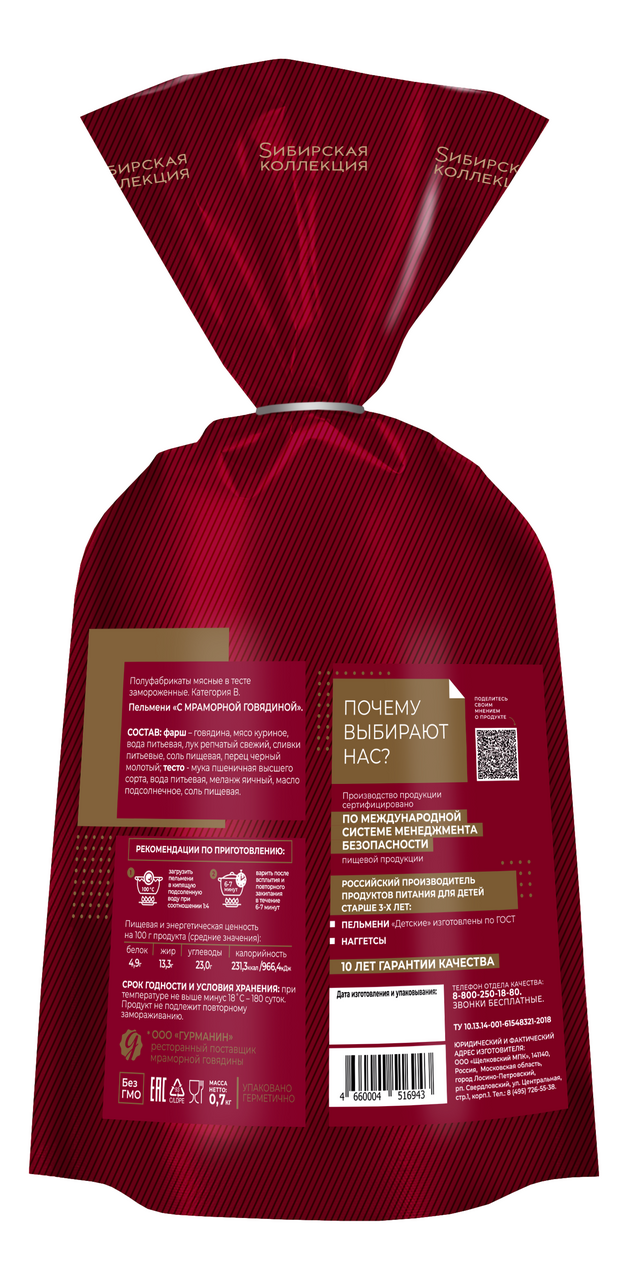 Пельмени Сибирская коллекция Gourmet с мраморной говядиной замороженные, 700г