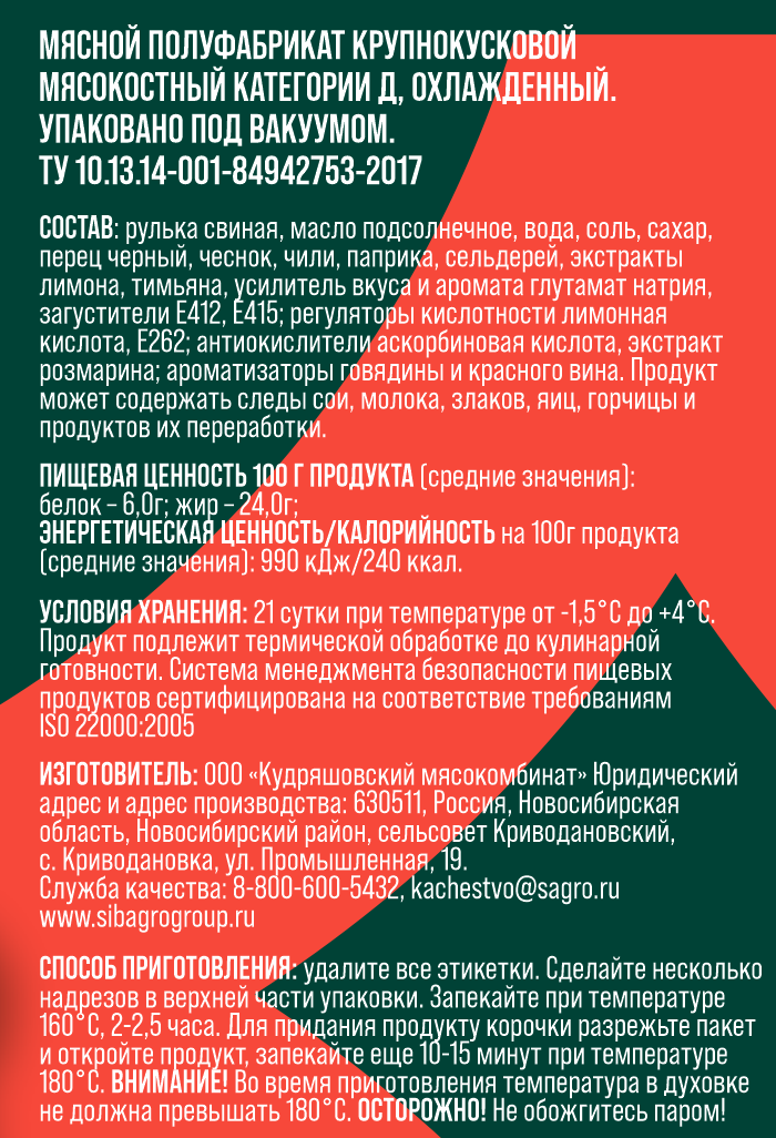 Рулька свиная, масло подсолнечное, вода, соль, сахар, перец черный, чеснок, чили, паприка, сельдерей, экстракты лимона, тимьяна, усилитель вкуса и аромата глутаматнатрия, загустители Е412, Е415; регуляторы кислотности лимонная кислота, Е262; антиокислители аскорбиновая кислота, экстракт розмарина; ароматизаторы говядины и красного вина.