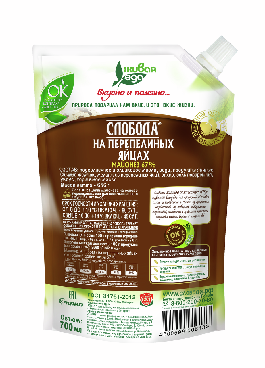 Слобода На Перепелиных Яйцах — классический майонез, дополненный пользой перепелиных яиц. В состав майонеза входят только натуральные ингредиенты, а свежие яичные желтки в рецептуре делают Слободу такой уникальной и неповторимой. Майонез на перепелиных яйцах обладает идеально сбалансированным вкусом и станет отличным дополнением к вашим любимым блюдам. Используйте его в качестве заправки для салата, маринада для рыбы и мяса, добавляйте в любимые бутерброды. Слобода объединяет вкус и пользу в одном продукте! Слобода — бренд, который знают и любят многие россияне уже на протяжении 30 лет. Все продукты Слобода отличаются настоящим вкусом и неизменным высоким качеством. Они не просто соответствуют ГОСТу, а обладают настоящей силой природы и производятся с заботой о будущем!