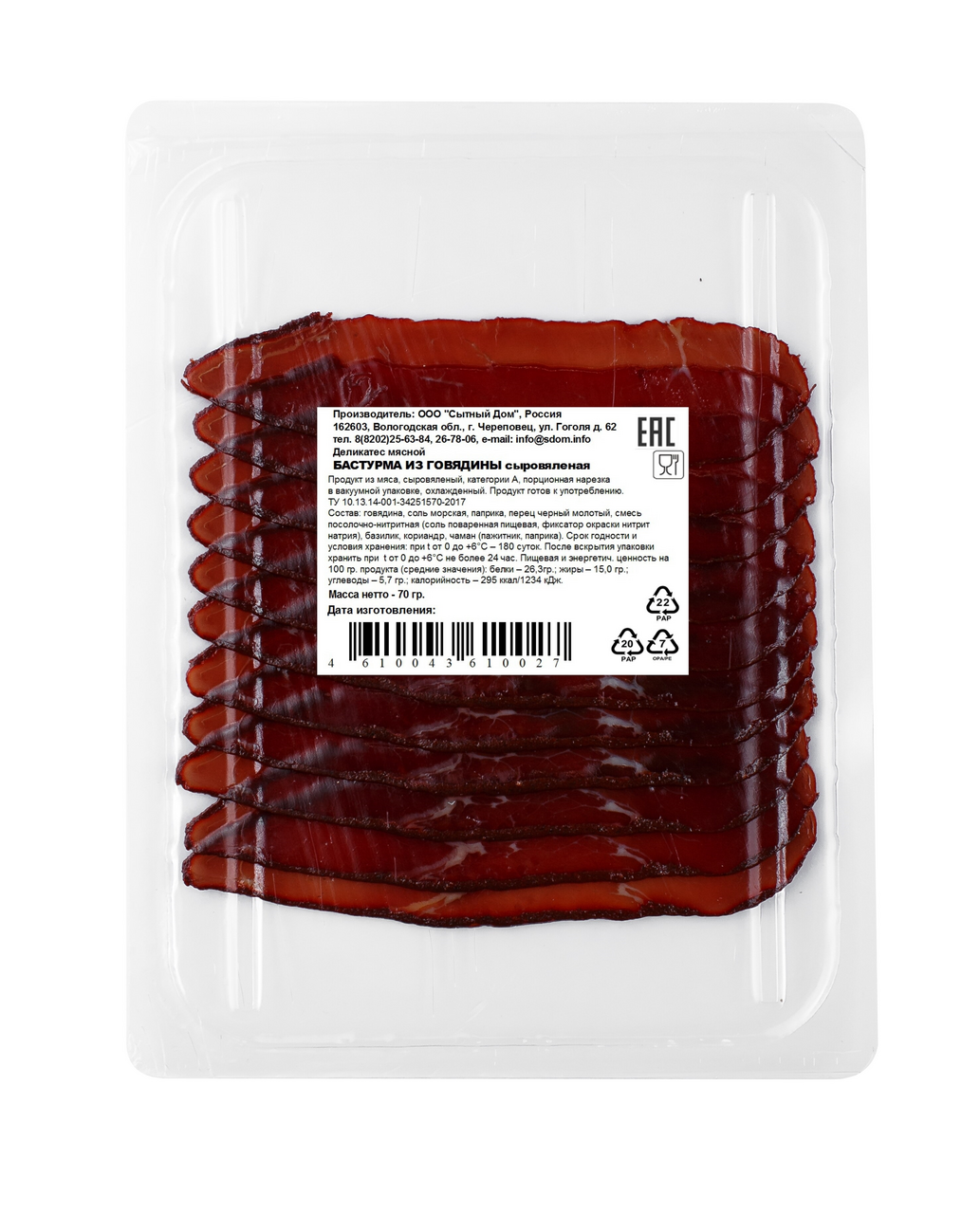 Бастурма из говядины сыровяленая Sd, 70г – мясной деликатес, который станет отличным дополнением как семейного, так и праздничного стола. Он представляет собой завяленную особым способом говяжью вырезку, которая сохраняет максимум полезных свойств мяса. Благодаря этому продукция имеет богатый химический состав. Она богата такими минералами, как железо, кальций, магний и фосфор, а также некоторыми витаминами и аминокислотами. Кроме говядины, продукт имеет целый ряд дополнительных ингредиентов: черный молотый перец, базилик, кориандр, чаман и некоторые другие. Мясной деликатес хорошо утоляет чувство голода, наполняет организм энергией и насыщает его. Чаще всего его подают в составе мясной нарезки и едят в чистом виде или в сочетании с овощами и свежей зеленью.