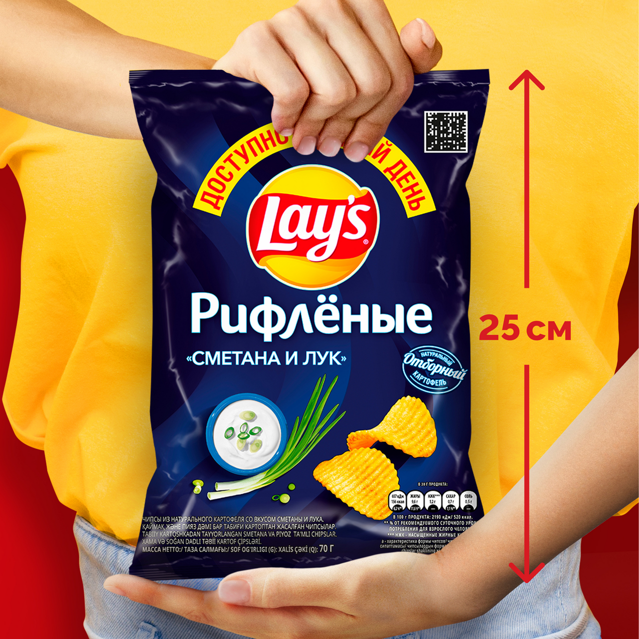 LAY'S - чипсы, каждая пачка которых изготовлена из специально отобранного картофеля и соответствует самым высоким стандартам качества.Рифленая текстура золотистой отборной картошки, нежный вкус сметаны и аромат молодого зеленого лука - внутри каждой пачки снеков LAY'S.Каждый день вкуснее с Lay's.