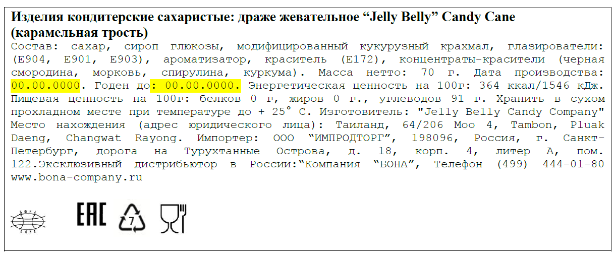 Сахар, сироп глюкозы, модифицированный кукурузный крахмал, глазирователи: E904, E901, E903, ароматизатор, краситель E172, концентраты-красители чёрная смородина, морковь, спирулина, куркума.