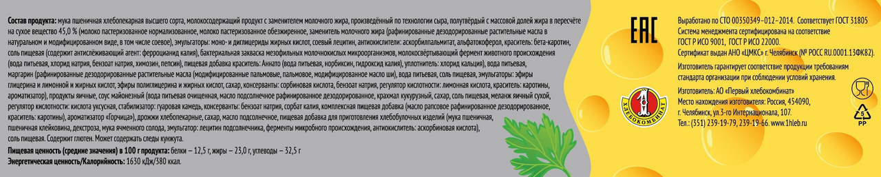 Мука пшеничная хлебопекарная высшего сорта, молокосодержащий продукт с заменителем молочного жира, произведённый по технологии сыра, полутвёрдый с массовой долей жира в пересчёте на сухое вещество 45,0 % (молоко пастеризованное нормализованное, молоко пастеризованное обезжиренное, заменитель молочного жира, эмульгаторы: моно- и диглицериды жирных кислот, соевый лецитин, антиокислители: аскорбилпальмитат, альфатокоферол, краситель: бета-каротин, соль пищевая, бактериальная закваска мезофильных молочнокислых микроорганизмов, молокосвёртывающий фермент животного происхождения (вода, хлорид натрия, бензоат натрия, химозин, пепсин), пищевая добавка краситель: аннато (вода, норбиксин, гидроксид калия), уплотнитель: хлорид кальция), вода питьевая, маргарин (рафинированные дезодорированные растительные масла, вода, соль, эмульгаторы: эфиры глицерина и лимонной и жирных кислот, эфиры полиглицерина и жирных кислот, cахар, консерванты: сорбиновая кислота, бензоат натрия, регулятор кислотности: лимонная кислота, краситель: каротины, ароматизатор), продукты яичные, соус майонезный (вода питьевая очищенная, масло подсолнечное рафинированное дезодорированное, крахмал кукурузный, сахар, соль, меланж яичный сухой, регулятор кислотности: кислота уксусная, стабилизатор: гуаровая камедь, консерванты: бензоат натрия, сорбат калия, комплексная пищевая добавка (масло рапсовое рафинированное дезодорированное, краситель: каротины), ароматизатор горчица), дрожжи хлебопекарные, сахар, масло подсолнечное, пищевая добавка для приготовления хлебобулочных изделий (мука пшеничная, пшеничная клейковина, декстроза, мука ячменного солода, эмульгатор: лецитин подсолнечника, ферменты микробного происхождения, антиокислитель: аскорбиновая кислота), соль пищевая.