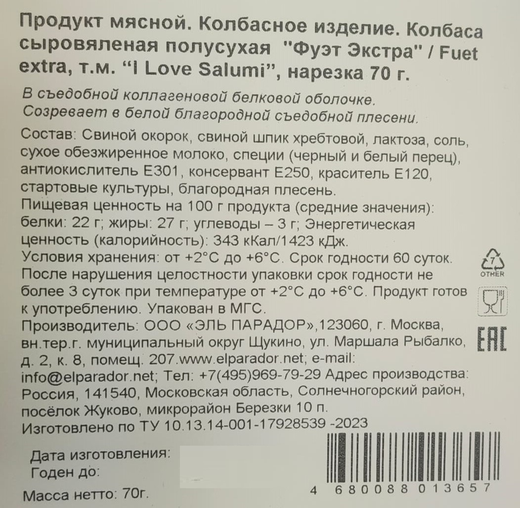 Колбаса I love Salumi Фуэт экстра сыровяленая, 70г