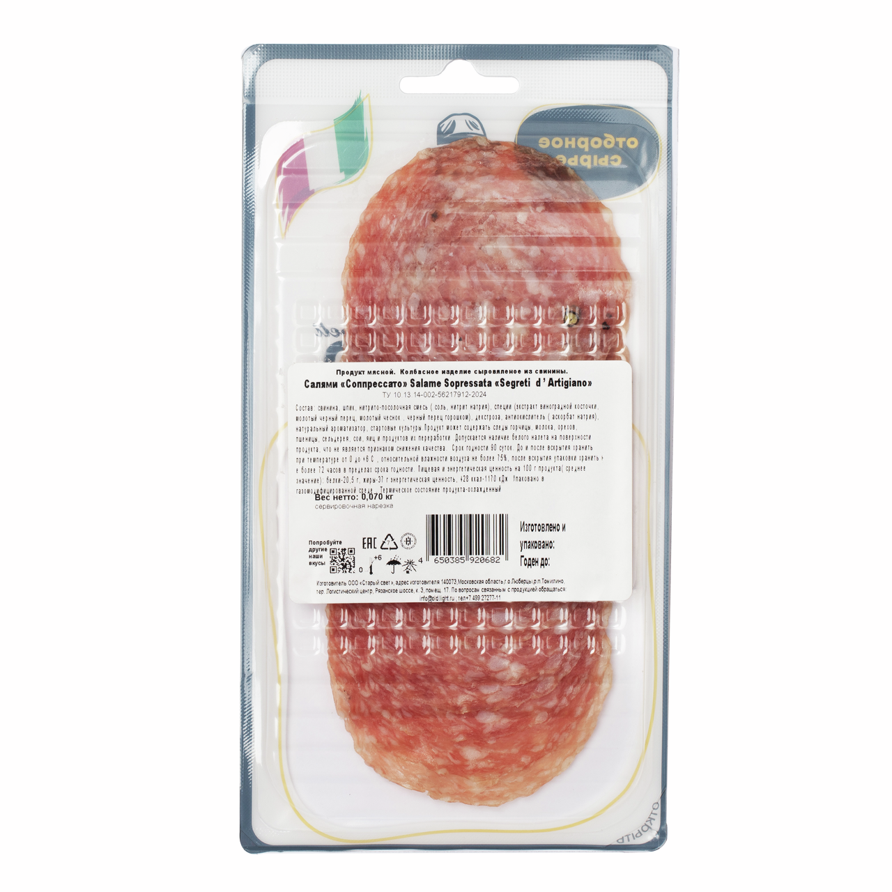 Колбаса Segreti D'Artigiano Сопрессато Салями сыровяленая нарезка, 70г