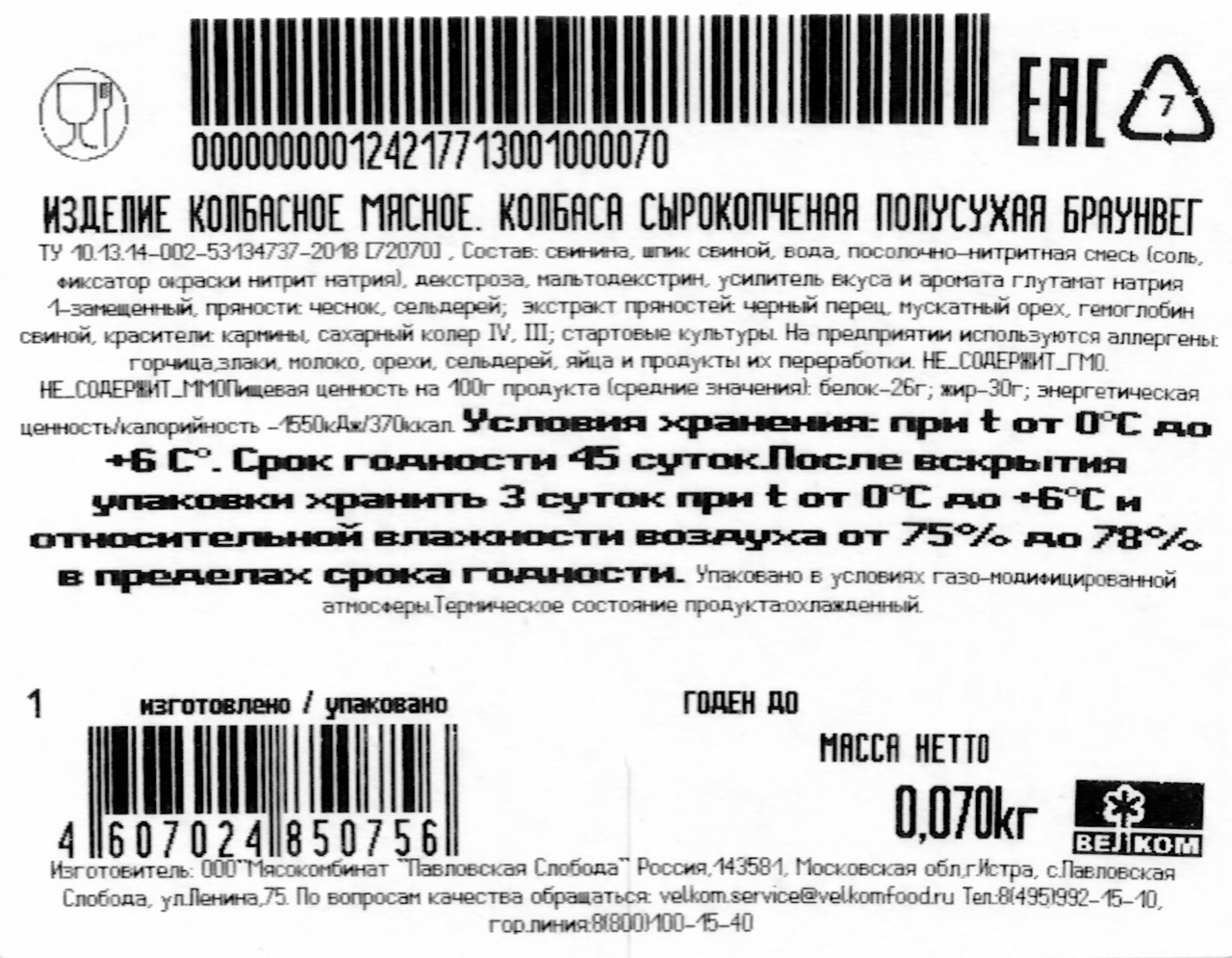 Колбаса Велком Брауншвейгская сырокопченая нарезка, 70г