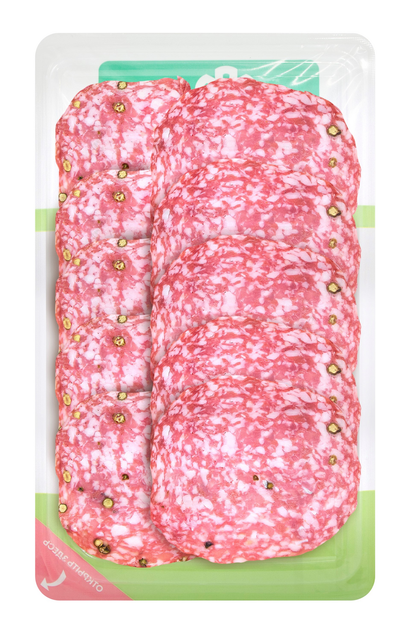 Сырокопченая колбаса из свинины и шпика высшего сорта с добавлением цельного зелёного перца-горошка, который придаёт неповторимый вкус, аромат и оригинальный вид на срезе. У продукта плотная, тёмно-красная структура с вкраплением мелких кусочков шпика. Пряный вкус колбасе добавляют имбирь, кориандр и горчица. Подойдет для вкусных бутербродов, аппетитной пиццы и сытной солянки.