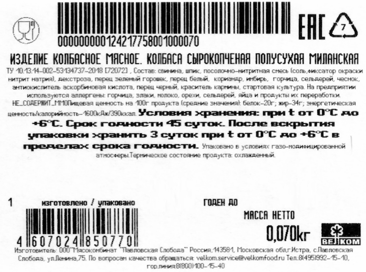 Колбаса Велком Миланская сырокопченая нарезка, 70г