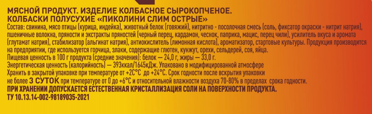 Свинина, шпик, филе птицы, животный белок, нитритно-посолочная смесь (соль, фиксатор окраски нитрит натрия), специи, экстракты специй (в том числе перец – чили), сахар, усилитель вкуса и аромата (глутамат натрия), мальтодекстрин, антиокислитель (изоаскорбат натрия), ароматизатор, краситель (кармин), стартовые культуры.