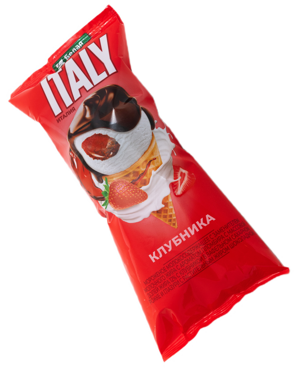 Мороженое Белая долина Italy с клубникой – это хрустящий вафельный рожок, покрытый темным шоколадом и заполненный мороженым с клубничным топпингом.