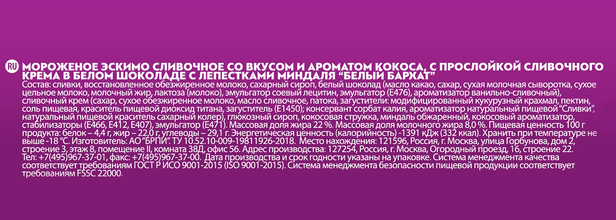 Cливки, восстановленное обезжиренное молоко, сахарный сироп, белый шоколад (масло какао, сахар, сухая молочная сыворотка, сухое цельное молоко, молочный жир, лактоза (молоко), эмульгатор соевый лецитин, эмульгатор (Е476), ароматизатор ванильно-сливочный), сливочный крем (сахар, сухое обезжиренное молоко, масло сливочное, патока крахмальная, загустители (Е1414, пектин), соль поваренная пищевая, пищевой краситель диоксид титана, загуститель (Е1450), консервант сорбат калия, ароматизатор натуральный пищевой “Сливки”, пищевой краситель сахарный колер), глюкозный сироп, кокосовая стружка, миндаль обжаренный (лепестки), ароматизатор Кокос, стабилизаторы (Е466, Е412, Е407), эмульгатор (Е471).