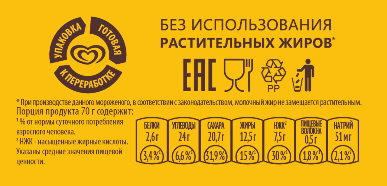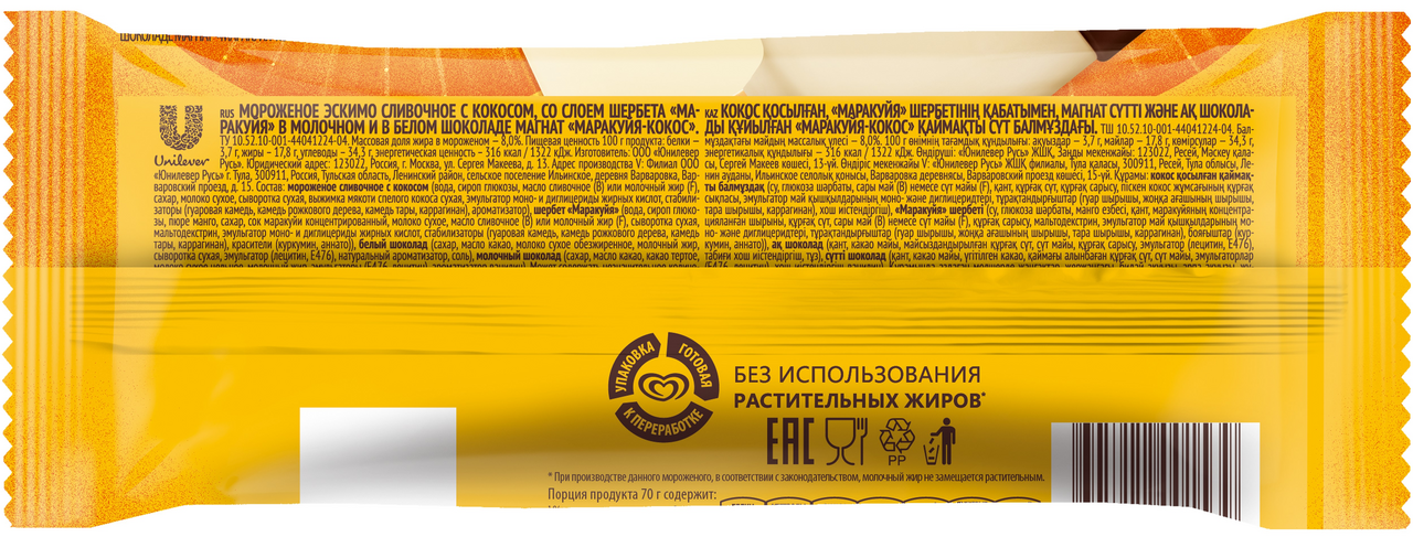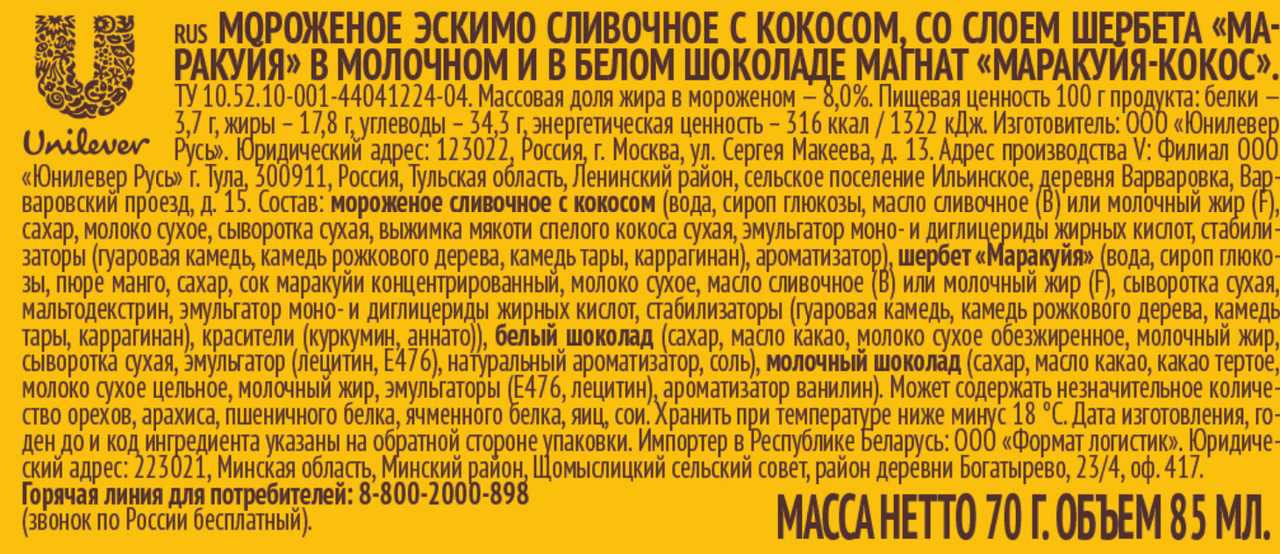 Мороженое сливочное с кокосом (вода, сироп глюкозы, масло сливочное (B) или молочный жир (F), сахар, молоко сухое, сыворотка сухая, выжимка мякоти спелого кокоса сухая, эмульгатор моно- и диглицериды жирных кислот, стабилизаторы (гуаровая камедь, камедь рожкового дерева, камедь тары, каррагинан), ароматизатор), шербет "Маракуйя" (вода, сироп глюкозы, пюре манго, сахар, сок маракуйи концентрированный, молоко сухое, масло сливочное (B) или молочный жир (F), сыворотка сухая, мальтодекстрин, эмульгатор моно- и диглицериды жирных кислот, стабилизаторы (гуаровая камедь, камедь рожкового дерева, камедь тары, каррагинан), красители (куркумин, аннато), белый шоколад (сахар, масло какао, молоко сухое обезжиренное, молочный жир, сыворотка сухая, эмульгатор (лецитин, E476), натуральный ароматизатор, соль), молочный шоколад (сахар, масло какао, какао тертое, молоко сухое цельное, молочный жир, эмульгаторы (Е476, лецитин), ароматизатор ванилин).