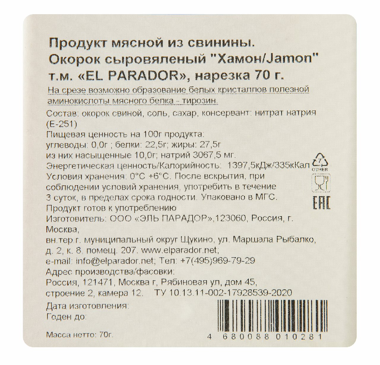 Изготовленный из мяса белых домашних свиней сыровяленый окорок Хамон компании El Parador является низкокалорийным продуктом. Он придется по душе тем, кто следит за своим здоровьем и фигурой. Деликатес содержит олеиновую кислоту, способствующую очистке крови и уменьшению уровня холестерина. Благодаря специфическому вкусу продукт подчеркнет вкус дыни и инжира. Также хамон прекрасно сочетается с красным вином, оливками и хлебом с помидорами.