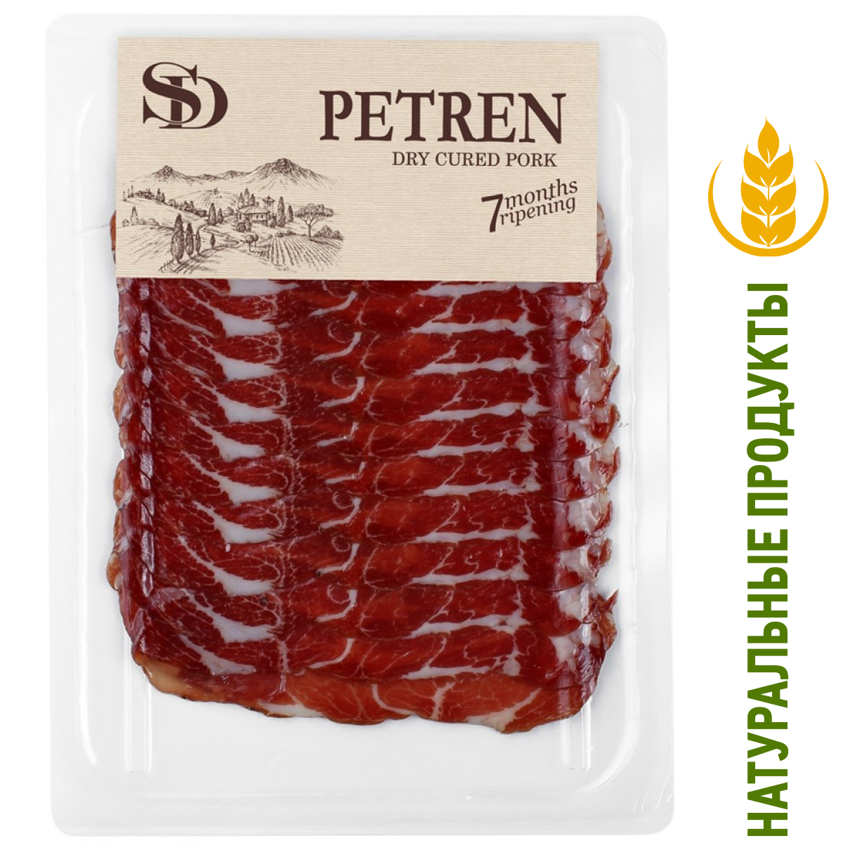 Петрен свинина сыровяленая Sd, 70г – мясной деликатес, который имеет яркий насыщенный вкус и приятный аромат, пробуждающий аппетит. Изготавливается при помощи вяления мяса, в процессе чего происходит обезвоживание высушиваемого продукта. В результате снижения влажности в нем образуются сложные белково-липидные комплексы, которые и придают продукту упругие и эластичные свойства. Кроме того, мясо имеет богатый химический состав, который представлен рядом витаминов и минералов, полезных для организма человека. Кроме свинины, деликатес дополнен смесью перцев, солью, чесноком и некоторыми другими ингредиентами. Продукт идеально подходит для украшения семейного и праздничного стола. Он идеально сочетается с разными овощами и свежей зеленью. Чаще всего его употребляют в чистом виде.