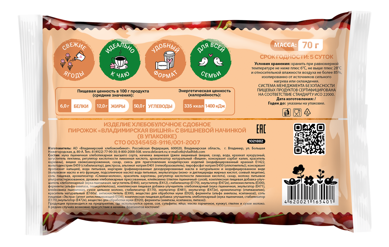 Легендарная Владимирская вишня - сочная и ароматная - наполняет пирожок вкусом теплого лета и ароматом детства. Сытный вкусный пирожок с сочной вишневой начинкой. Прекрасное дополнение к любому чаепитию и празднику. Отличное лакомство для вас и ваших детей. Теперь в удобном формате по еще более привлекательной цене. Мягкие и пышные пирожки из сдобного, особо нежного теста на молоке, выпеченные по домашним рецептам. Начинка из свежих ягод сохраняет свое природное богатство и вкус. Вишня наполняет пирожок вкусом теплого лета и ароматом детства.