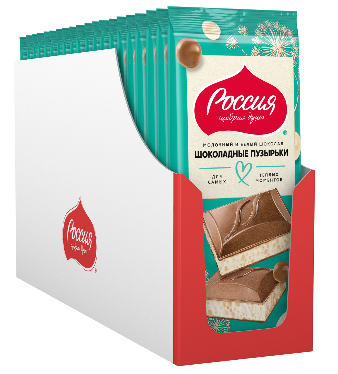 Шоколадные пузырьки от бренда Россия- щедрая душа! - это нежная воздушная классика, способная растопить ваши сердца. Отборное молоко, качественные какао-бобы и элегантный дизайн упаковки доставят вам эстетическое и гастрономическое удовольствие. Изящная обновленная форма дольки шоколада раскрывает весь яркий и насыщенный молочный вкус. Воздушные пузырьки в шоколаде медленно таят во рту, а сочетание нежного белого и молочного шоколада доставляют особое удовольствие.