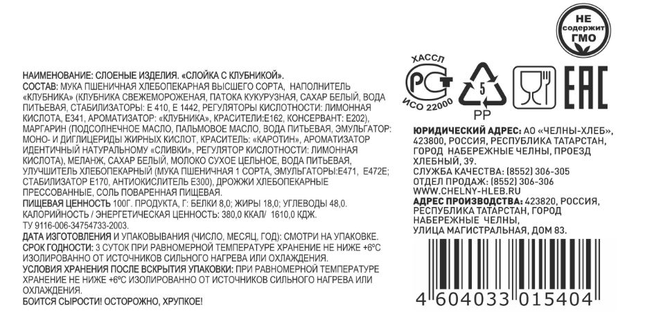 Мука пшеничная хлебопекарная высшего сорта, наполнитель Клубника вода питьевая, клубника свежемороженая, фруктоза, загуститель Е1442, сахар белый, патока кукурузная, влагоудерживающий агент Е422, сироп сорбитовый, ароматизатор Клубника, подсластитель Е952, консерванты: Е202, Е211, красители: Е122, Е155, маргарин для слоеных изделий рафинированные дезодорированные масла в натуральном и модифицированном виде, пальмовое масло и его фракции, подсолнечное масло, вода питьевая, эмульгаторы Е471, Е475, соевый лецитин, соль пищевая, консервант Е202, краситель Е160а, регулятор кислотности лимонная кислота, ароматизатор, вода питьевая, сахар белый, яйца куриные пищевые, маргарин столовый рафинированные дезодорированные масла пальмовое масло и его фракции, подсолнечное масло, вода питьевая, эмульгаторы Е471, соевый лецитин, соль пищевая, ароматизатор Сливки-молоко, краситель Е160а, регулятор кислотности: лимонная кислота, дрожжи хлебопекарные прессованные, улучшитель хлебопекарный пшеничная клейковина, эмульгатор Е472е, антиокислитель Е300, ферменты альфа-амилаза и гемицеллюлаза, соль поваренная пищевая.