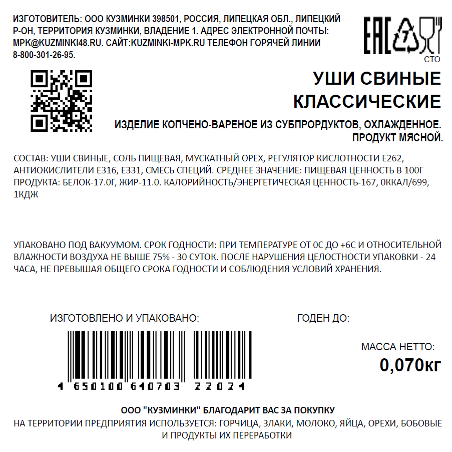 Уши свиные, соль пищевая, мускатный орех, регулятор кислотности е262, антиокислители е316, е331, смесь специй.