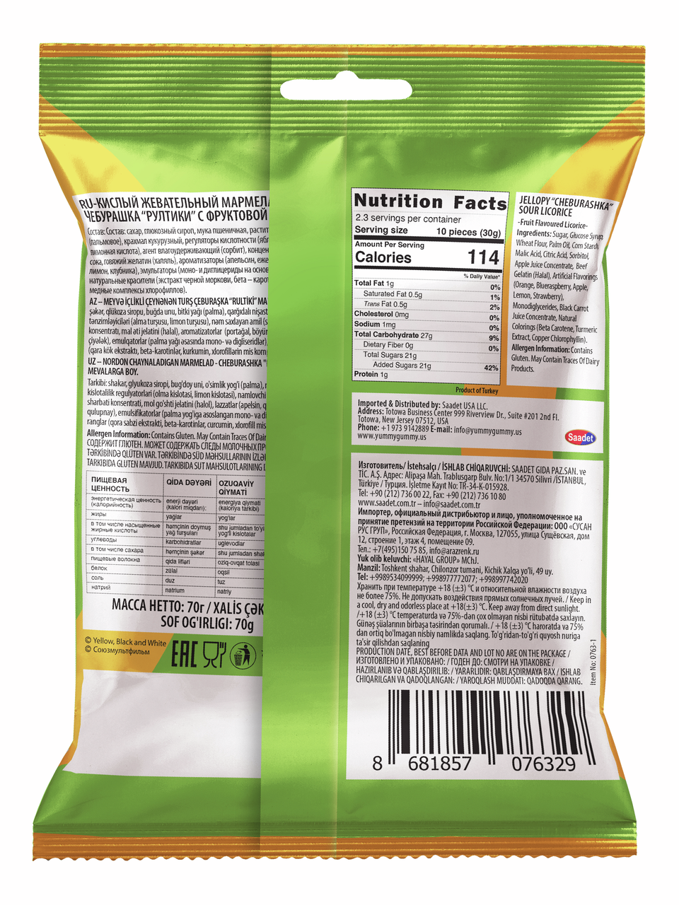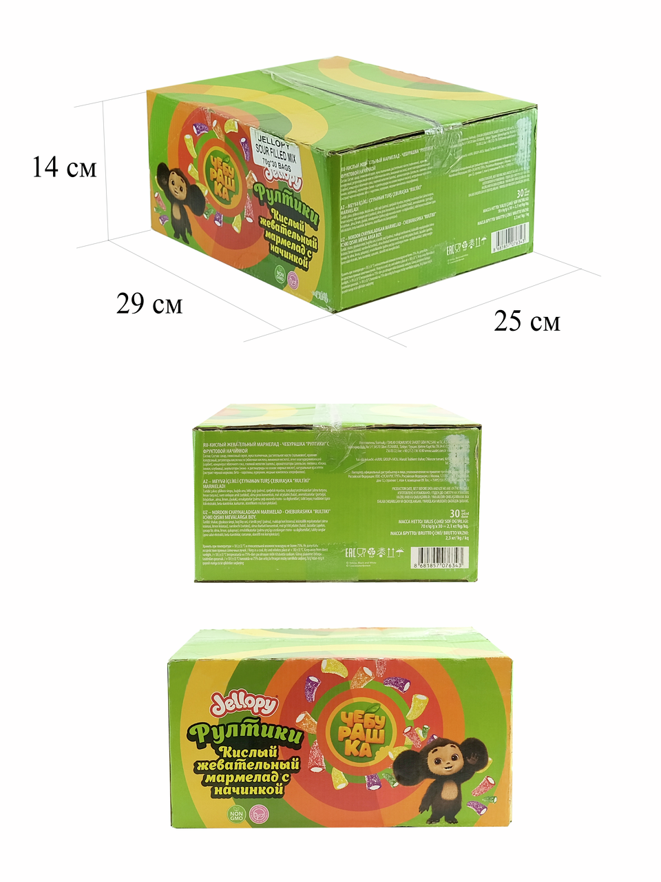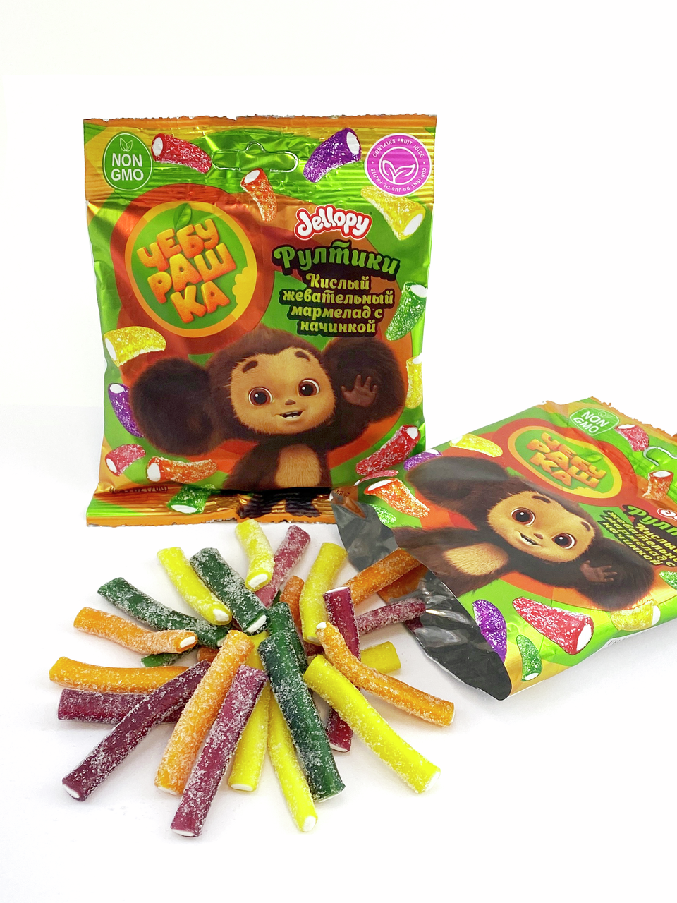 Чебурашка на сегодня самый сильный и узнаваемый бренд на российском рынке. Кислый жевательный мармелад со вкусами клубники, лимона, апельсина, яблока, ежевики обрадует, как одного ребенка, так и большую компанию. Ароматный десерт, который подарит настоящее удовольствие. Жевательный мармелад с ароматом фруктов в удобной упаковке можно взять с собой и насладиться угощением в любое время. Оригинальный в меру кислый мармелад придется по вкусу, как взрослым, так и детям.